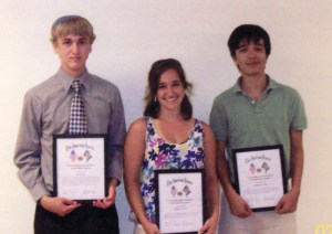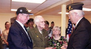 Turner American Legion Post 111 honored scholarship winners Aimee Giffune of Turner and Jesse Juntura of Greene before a gathering of family and friends. Aimee will attend Clarkson University; Jesse will attend Colby College. Mark Hite of Leeds was also honored as the community’s representative to Dirigo Boys State. Top photo, from left, are Hite, Giffune and Juntura. Following the presentations, two members of the Greatest Generation, Henry Poisson and Clifford Eisner were presented with Department of the Army medals for their action in the Battle of the Bulge. Both gentlemen were afforded a standing ovation by the appreciative audience. Bottom photo, from left, Poisson, Eisner, his daughter Gloria Bryant and Commander Ken Finley making the presentation.