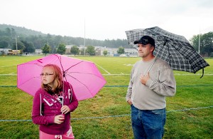 Carleen Hutchinson, 12, of Carthage and her dad, Warren, wait during a rain delay for the start of the Dirigo and Lisbon football game at Dirigo High School in Dixfield on Friday evening. Hutchinson’s brother, Jesse, plays linebacker and offensive guard for the Dirigo Cougars.