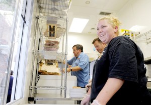 Stacy Blount of Lisbon, Dave Dubois, center, of Durham and David Fox of Detroit serve pizza to those in need Wednesday. Blount is the manager at the Little Caesars in Auburn. Dave Dubois, the owner of five local Little Caesars franchises, supplied the ingredients for 61 pizzas and the labor to serve them. Fox is the driver of Love Kitchen, which is based in Detroit.