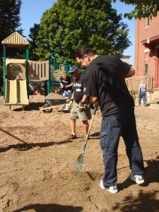 Androscoggin Bank employee David Pease joins a crew of volunteers to clean up the playground at Androscoggin Head Start in Lewiston. Pease, who is a member of the United Way of Androscoggin County board of directors, was one of hundreds of people who spent much of Friday volunteering as part of the United Way’s annual Day of Caring. This year, according to the United Way, 263 volunteers, representing 23 companies, in cooperation with 16 nonprofit groups and agencies, worked to complete 30 projects across Androscoggin County.