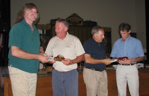 Rumford Selectman Jeff Sterling, left, presents a Rumford Distinguished Citizens of the Year 2012-13 award to James Nicols of Mexico on Thursday night while Selectmen Chairman Greg Buccina does likewise to Billy Nicols, right, of Rumford. The brothers were awarded the distinction for lending Rumford temporary use of their company’s logging bridge to span Bean Brook. They voluntarily installed it after flooding from Tropical Storm Irene destroyed the Swain Road bridge Aug. 28 and 29, 2011.