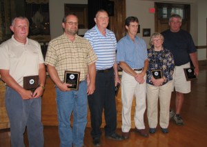Rumford selectmen recognized the service of several people at Thursday night’s meeting. From left are James Nicols, who with his brother Billy Nicols, third from right, were named Rumford’s Distinguished Citizens of the Year 2012-13; Ronald E. Russell, who served on the Board of Appraisers from 2004-10; Russell’s father, Ronald M. Russell, who served on the Finance Committee from 2004-10; Peggy Susbury, who served on the Rumford Public Library Board of Trustees from 1997-2012; and Dan Peare, who was a Public Works employee from 1979-2012. Not shown but also recognized were Theresa Prue, who served on the library board from 2001-10, and Spencer Couture, who served as a call force firefighter from 1975-2012.