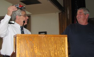 Retired Rumford Public Works employee Dan Peare, who served the town 33 years, laughs at right as Town Manager Carlo Puiia presents him with a snowplow truck to accompany the service award he received from selectmen Thursday night.