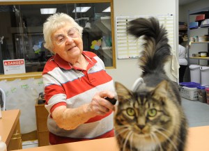McMillin has volunteered at the animal hospital every day for the past 13 years. Nearly 91 years old, she still arrives each afternoon to wash the windows, take out the trash, soothe worried owners and calm frightened pets with soft words and light touches.