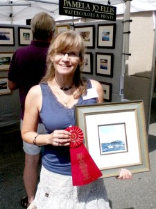Pamela Jo Ellis of Rangeley was the recipient of the Second Festival Prize at the WCSH-6 Portland Art Festival held Aug. 25 on Congress Street in Portland. Three hundred artists from all over New England participated in the day-long festival. Ellis’ winning painting was a five-inch by five-inch watercolor titled “Lakesky Fractal,” which depicts Rangeley Lake and Bald Mountain from the east shore, with the waves sending spray up against a dock and rock jetty and fair weather clouds in the background. This is the second time Ellis has received a prize at the festival.
