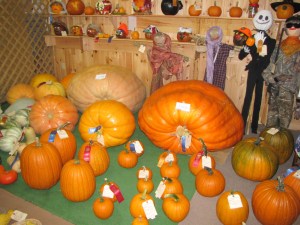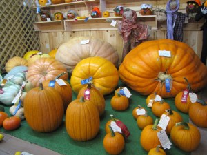The largest pumpkin on display in the Exhibition Hall at Farmington Fair on Sunday, right, was grown by Tim Cummings of Farmington and weighed 572 pounds. The second largest on left was 552 pounds.
