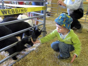 Tristan Woodman, 2, of Strong feeds the miniature goats Sunday on the first day of Farmington Fair as parents Darlene and Steven Woodman watch.