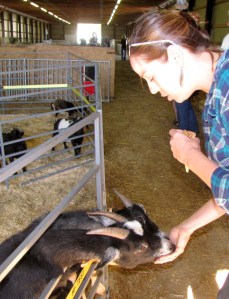 Darcy Cook of Farmington feeds food pellets to the miniature goats Sunday — the first day of Farmington Fair.