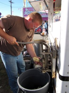 James Arey of Masardis cuts potatoes for King and Queen french fry stand Sunday during the first day of Farmington Fair.