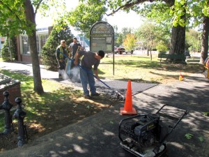 Pavers finish walkways in Meetinghouse Park under sunny skies Tuesday. As part of a Community Development Block Grant project, the walkways were redone providing better handicap accessibility. Paving are Ben Powers, Linwood Randall and Heath Bell from P&B Paving of Gray.
