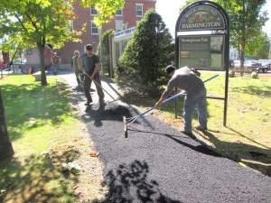 Pavers finish the walkways of Meetinghouse Park under sunny skies Tuesday. As part of a Community Development Block Grant project, the walkways were redone providing better handicap accessibility to the park. Paving are Ben Powers, right, Heath Bell, and, in back, Linwood Randall and Lloyd MacDonald from P&B Paving of Gray.