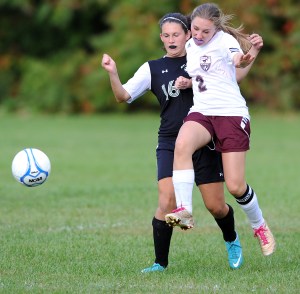 The junior beautifully bent a direct kick from about 20 yards. Saints goalie Kelly Pomerleau’s only recourse was to leap high in the air and brush it off the crossbar.