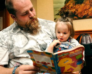 Justin Hartung of Auburn reads a “Sesame Street” book to his 19-month-old daughter, Ava, during Literacy Night at the Auburn Public Library on Tuesday. The Pre-K Literacy Night is a program of the Auburn School Department’s Pre-K team, in collaboration with the Auburn Public Library.
