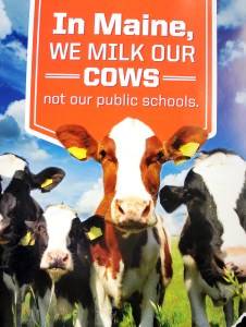 “In Maine, we milk our cows, not our public schools,” it reads.