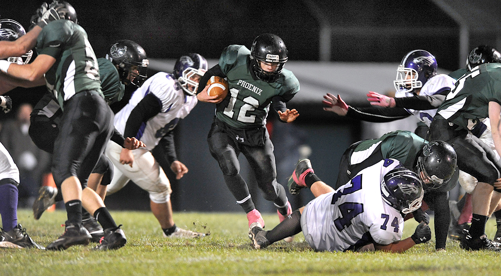Spruce scored two plays into the third quarter on a 69-yard run up the left side by Vigue. The Phoenix were guilty of arm tackles and Marshwood (6-1) proved to be no fluke. On the ensuing possession, Roll scored on a 22-yard run, capping a 5-yard drive.
