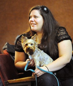 “There’s a comfy spot for Kale,” cooed his owner, Marissa Lussier, as she settled the pooch in Warren’s arms before rehearsal Thursday. “It’s like a happy purse. He’s a happy accessory.”