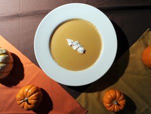 Note: Harvest pumpkin soup can also be made with sweet potato instead of pumpkin, for a slightly different taste. This is “a sweet soup,” says Chef Gard Briggs. To cut back on sweetness he recommends decreasing the amount of brown sugar. Also, for a less rich and caloric version, he suggests using milk instead of heavy cream. (To prepare the pumpkin puree, cut two medium cooking pumpkins in half, scoop out the seeds, drizzle with a little olive oil and roast at 400 degrees for half an hour. When the pumpkin is soft, remove the skin and puree.