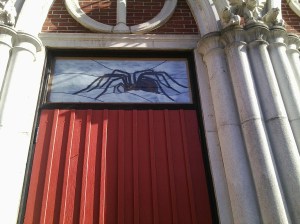 Along the way, Nutting points to stained-glass black widows and tarantulas, one on his front door, one next to a stained-glass depiction of the Moxie man.