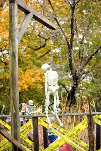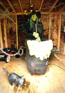 Caron and Turner start at the end of September pulling all of the decorations and makeshift walls out of any nook and cranny they have for storage. Slowly, the backyard of their East Avenue house is transformed into a a frightening array of witches, zombie babies, skeletons, clowns and anything else Caron could build to frighten his guests.