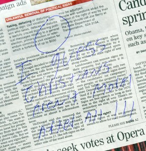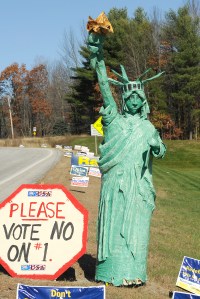 For almost two weeks the Lady Liberty had stood next to a large, plywood “No on Question 1” sign near the Calvary Baptist Church. The thieves, Viger believes, blame her for repeatedly taking down nearby “Yes on Question 1” signs.
