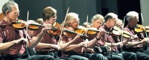 Music Director Don Roy, left, leads a diverse group of fiddlers and other musicians of all ages and walks of life in a tune Sunday afternoon during their performance at the Franco-American Heritage Center. The group, Fiddle-icious, evolved out of a monthly fiddle workshop led by Don Roy and, after months of practice, has put on several public performances. For more information on the group, visit fiddleicious.com; to watch a video from Sunday’s performance, visit sunjournal.com/fiddleicious102812.