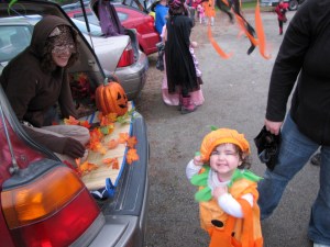 Bethany Steward of Jay receives a treat from Dori James during a trunk a treat Halloween event at Living Waters Church in Farmington on Wednesday. Pastor Steve Bracy and his wife got the idea from a Portland church, giving out treats from the decorated trunks of cars. About 10 vehicles lined up behind the church to greet the children.