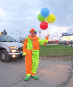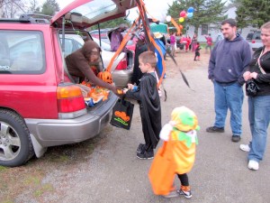 Pastor Steve Bracy welcomes trick-or-treaters at Living Waters Church in Farmington on Wednesday. He and his wife got the idea for trunk a treat, passing out candy from car trunks, from a Portland church. About 10 vehicles lined up behind the church to greet the children.