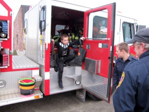 Justin Steward of Jay leaves the cab of a Farmington firetruck that participated in the trunk a treat Halloween event at Living Waters Church in Farmington on Wednesday. Firefighters Michael and Andrew Cote passed out candy to children.