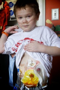 He spent his first nine months in the Portland facility, and immediately after being released began what has become a life of travel and long hospital stays. He has stayed in Boston Children’s Hospital and Nationwide Children’s Hospital in Columbus, Ohio. He has endured more than 50 surgeries, many of them major procedures, in which his ravaged organs, one-by-one, were replaced by tubes and sacks hanging out of his torso.