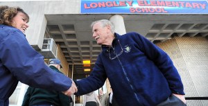 Patti Gagne, of Lewiston, is greeted by Angus King as she heads into the Multi Purpose Center in Lewiston Tuesday morning to cast her vote.