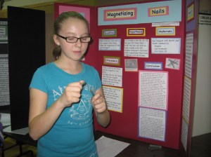 Megan Mercier of Livermore demonstrates how tapping a large nail with a magnet increases the magnetism. Her demonstration was part of the annual seventh-grade science fair at Spruce Mountain Middle School in Jay on Wednesday night. She won two medals in the physics category.