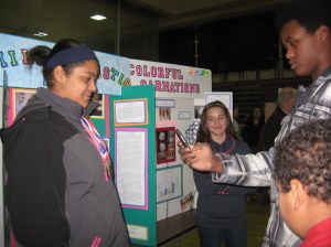 Alwayne Uter, 17, a junior at Spruce Mountain High School in Livermore Falls, takes a picture of his sister, seventh-grader Alivia Uter, at Wednesday night’s Spruce Mountain Middle School science fair in Jay, as their younger brother, Kaiden, 8, and another student look on. Alivia took four medals for her project “Milk into Plastic.”