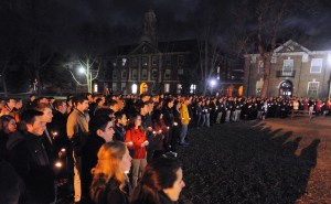 After Dana and Green spoke, the crowd moved outside Fogler Library, where a large outdoor screen displayed a slide show set to music. Memorial attendees held lit tea light candles while pictures flashed on the screen.