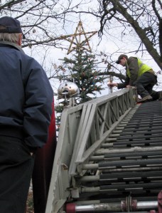 Mexico firefighter Mark Mayo, left, operates the extension ladder Wednesday morning for Mexico Highway Department employee Craig Wade, so Wade can string Christmas lights on the tallest evergreen at the Mexico Green beside Routes 2 and 17. The temperature was 24 degrees.