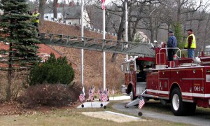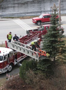 Mexico Highway Department worker Craig Wade, left, strings Christmas lights from a ladder extended from a Mexico firetruck on Wednesday morning at the Mexico Green beside Routes 2 and 17. Watching from atop the firetruck are highway worker Toby Duguay, right, and firetruck ladder operator Mark Mayo.