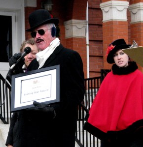 Then, Nancy Teel, the volunteer coordinator of the United Way of the Tri-Valley area, recognized Clyde Ross’s volunteerism and portrayal of Chester Greenwood since 1986, presenting him with a Shining Star award.