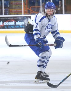At St. Dom’s, the strength of the team’s defense begins between the pipes. Going on three years, the Saints have turned to seniors Austin Christopher and Grant Carrier to stop the majority of pucks thrown at their cage. Both are all-state caliber keepers.