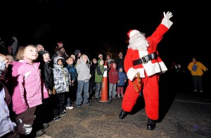 Children look as Santa Claus lights the Turner Christmas tree at the town office Monday. Santa arrived on top of a firetruck for the fifth annual lighting. Inside the Town Office, he met with children and let them pick out a gift. Go to sunjournal.com/turnersanta to watch a video.