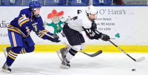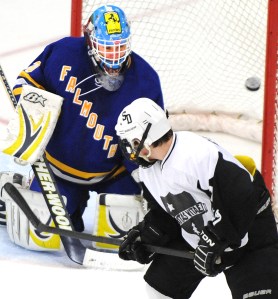 Falmouth set the Saints back on their heels by striking quickly in each period. They took the early lead on Alden Bohrmann’s goal 13 seconds into the game’s first power play and four minutes into the game. Falmouth made it 2-0 58 seconds into the second period when a St. Dom’s defender whiffed on the puck. Kris Samaras collected it inside the blue line skated in all alone to beat helpless Saints goalie Austin Christopher.