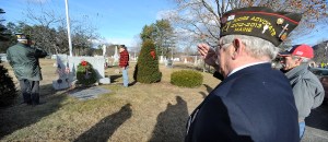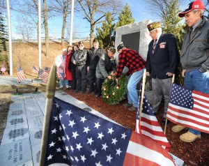 Oscar Hebert, middle left, of Dixfield and Kirk Thurston, middle right, of Rumford lay a wreath at Veterans Greens in Mexico on Sunday morning. Looking on, from left, are Mavis Powell of Dixfield, Barbara Arsenault of Rumford, Bridget Daigle of Dixfield, Edward Ellis of Dixfield, Jim Scott of Rumford, Hebert, Thurston, Gerald Francis of Peru and event organizer Robert “Bub” Desroches of Dixfield. Desroches, working with American Legion posts, the state commander, state president of the Veterans of Foreign Wars and the Rumford VFW president, organized a wreath-laying ceremony for local war memorials. Desroches said he laid wreaths in 29 cemeteries throughout the Evergreen Valley on Saturday and continued in Rumford, Mexico, Dixfield, Peru and others Sunday.