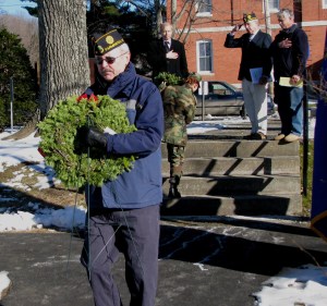 He then shared a brief background of the Worcester Wreath Co. of Harrington, which supplied 750 wreaths to be placed in ceremonies much like Post 28’s, simultaneously at noon Saturday across the nation and at 24 national cemeteries on foreign soil.