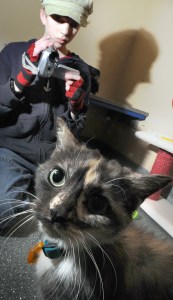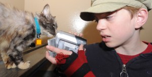 The young cat rubs her chin across the Greater Androscoggin Humane Society’s rope toy and purrs. She walks across 12-year-old Linus’ lap and purrs. She looks into his video camera … and purrs.