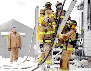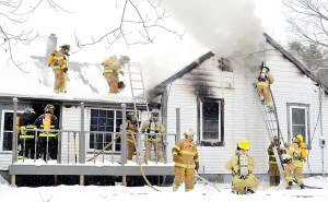 Firefighters propped a ladder against the exterior of one end of the cape at 133 Bryant Road. A firefighter at the top of the ladder aimed a hose through an open window from which smoke poured.