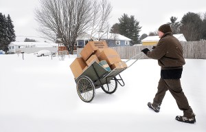 Warren Fink of UPS pushes a garden cart down Suzanne Street in Lewiston as he makes parcel deliveries Monday. Fink, a seasonal worker for UPS, said it’s the busiest time of the year, and it’s a great way to earn some money.
