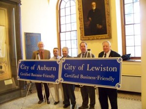 City officials from Lewiston and Auburn officially receive certification as a Business-Friendly Community by representatives from the Maine Department of Economic and Community Development in Augusta on Monday, Dec. 17. From left are: Auburn Director of Economic Development Roland Miller; Auburn Assistant Manager Howard Kroll; Androscoggin County Chamber of Commerce President Chip Morrison; Lewiston Director of Economic & Community Development Lincoln Jeffers; Lewiston Mayor Robert Macdonald.