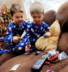 Conner demonstrated how his remote-control helicopter worked. When he turned it on, it made a buzzing sound, lit up and took flight, hovering against the ceiling before landing on the carpet. The brothers’ eyes lit up with delight as the toy flew around the living room.