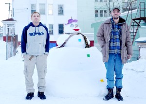 Johnny Pair, left, and Adam Carrick built a plump snowman outside their apartment building at Ash and Pierce streets in Lewiston on Friday. The neighbors started making a pile of snow Thursday morning, then finished the snowman with two blueberry cans for eyes around 3 p.m. Friday. “The last time I saw snow was 2008,” Carrick said. The two recently moved back to Lewiston from the South. “We are just rednecks from Georgia,” Pair said.