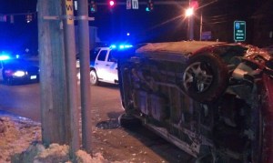 BANGOR — A driver distracted by his cellphone struck a snowbank and utility pole on Saturday evening, flipping his van onto its side and snarling traffic on Broadway in the area of the Interstate 95 offramp, according to police.