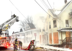 As they battled the flames, crowds gathered on front lawns and snow-covered sidewalks. In the distance behind the burning building, kids slid down the hills at Pettengill Park.
