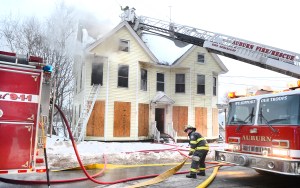 AUBURN — A 2½-story apartment house went up in flames on Gamage Avenue Wednesday, and fire investigators say the blaze is suspicious.